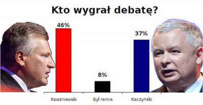 Telewizyjną debatę wygrał Aleksander Kwaśniewski – tak wynika z sondażu MillwardBrown SMG/KRC na zlecenie „Faktów” RMF FM i programu „Teraz My” telewizji TVN. 25,5 procent ankietowanych uważa, że były prezydent wygrał ją zdecydowanie. Niespełna 20 procent, że raczej on jest zwycięzcą tego pojedynku.