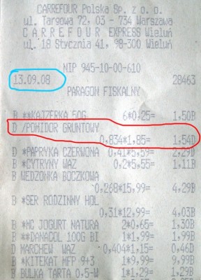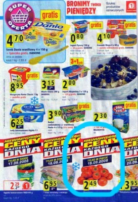 Oto mały przykład, na który natknąłem się przypadkiem, a który jako czujny klient wychwyciłem . Otóż wczoraj tj. 13.09.08 sobota, dokonałem zakupu w jednym z pobliskich sklepów, kilku sztuk pomidorów po dosyć przystępnej cenie 1,85 zł/kg. Wracając z udanych zakupów do domu, tradycyjnie zaopatrzyłem się w ulotkę (których na naszych klatkach schodowych nigdy nie brakuje ), tegoż sklepu, w którym notabene jestem częstym klientem. Nie będę mówił o jaki sklep chodzi, ale poniżej wkleję dowody na to o czym piszę, to każdy bez problemu będzie wiedział o jaki to sklep chodzi . No i czytam na owej ulotce że w piątek 19.09.08 będzie cena dnia na pomidory, tylko 2,49 zł za kilogram. Jednym słowem rewelacja, tylko trochę zbaraniałem, bo nie wiem czy ten sklep to zachęca mnie; do kupowania tych pomidorów, czy raczej do omijania tego asortymentu w tym dniu szerokim łukiem?