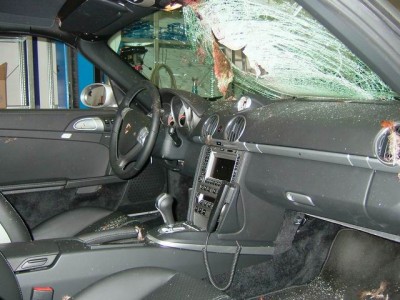 bleeeee... ale zarzygane to auto od krwi :? moim rodzicom kiedys bazant tak w szybe uderzył, za wolno nie jechali, ale na szczecie zatrzymal sie na szybie i nie "wleciał" bo srodka jak ten "pasazer na gape" :lol: