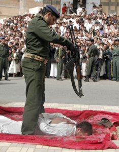 Setki Jemeńczyków zebrało się na placu rodzinnego miasta pedofila, aby zobaczyć jego egzekucję. Mężczyzna prowadzony przez strażnika, został położony twarzą do ziemi na czerwonym płótnie, z rękami związanymi z tyłu.